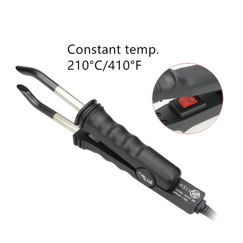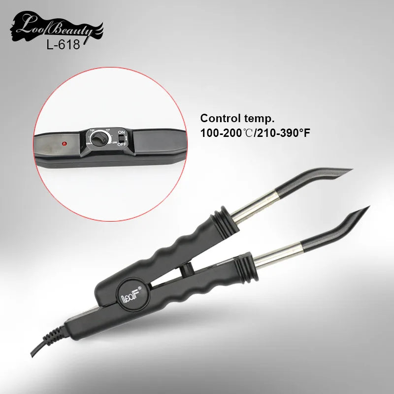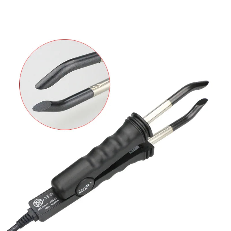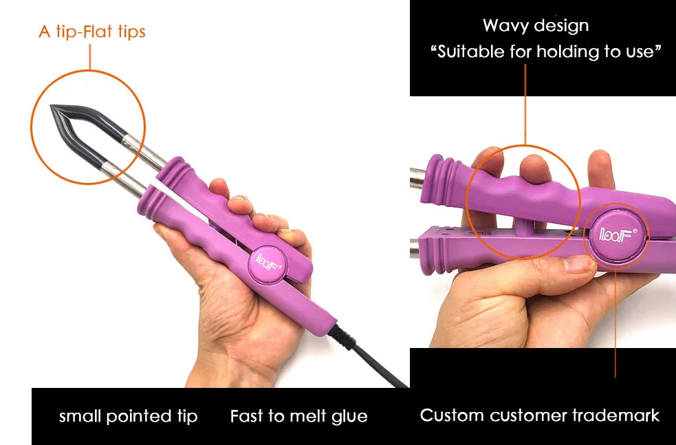 3. Design pratique : Son embout plat est spécialement conçu pour adhérer parfaitement aux mèches d'extensions en kératine plate. Cette caractéristique permet d'assurer un résultat soigné et sécurisé sans risque d'endommager les cheveux naturels.